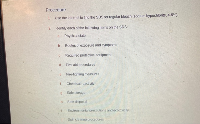 Solved Procedure Use The Internet To Find The Sds For Regular Bleach Sodium Hypochlorite 4 6 Identify Each Of The Following Items On The Sds Physical State Routes Of Exposure And Symptoms Requlred